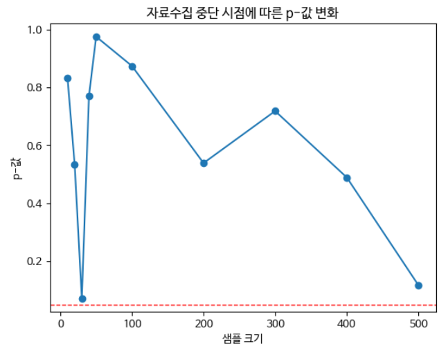 - 데이터 수집을 시작하기 전에 언제 수집을 중단할지 명확하게 결정하지 않으면, 원하는 결과가 나올 때가지 데이터를 계속 수집할 수 있음. 이는 결과의 신뢰성을 떨어뜨림